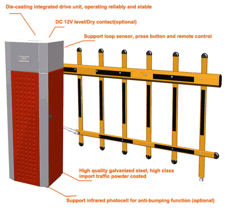 Fujica fence boom barrier gate,self design and manufacture, highly integrated mechanism and control system, 100% heavy duty operation. Adopts high quality galvanized steel and high class imported traffic powder coated.