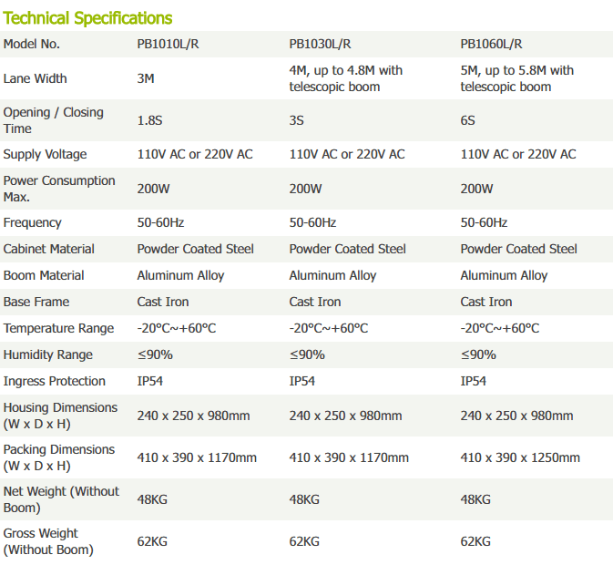 The boom can be equipped with pressure wave. When there is any hindrance during the boom lowering, the boom will be automatically raised to prevent it from striking vehicles or people. LED light tape is also optional for changing color in boom raising or lowering, helping driver avoid hitting the boom.